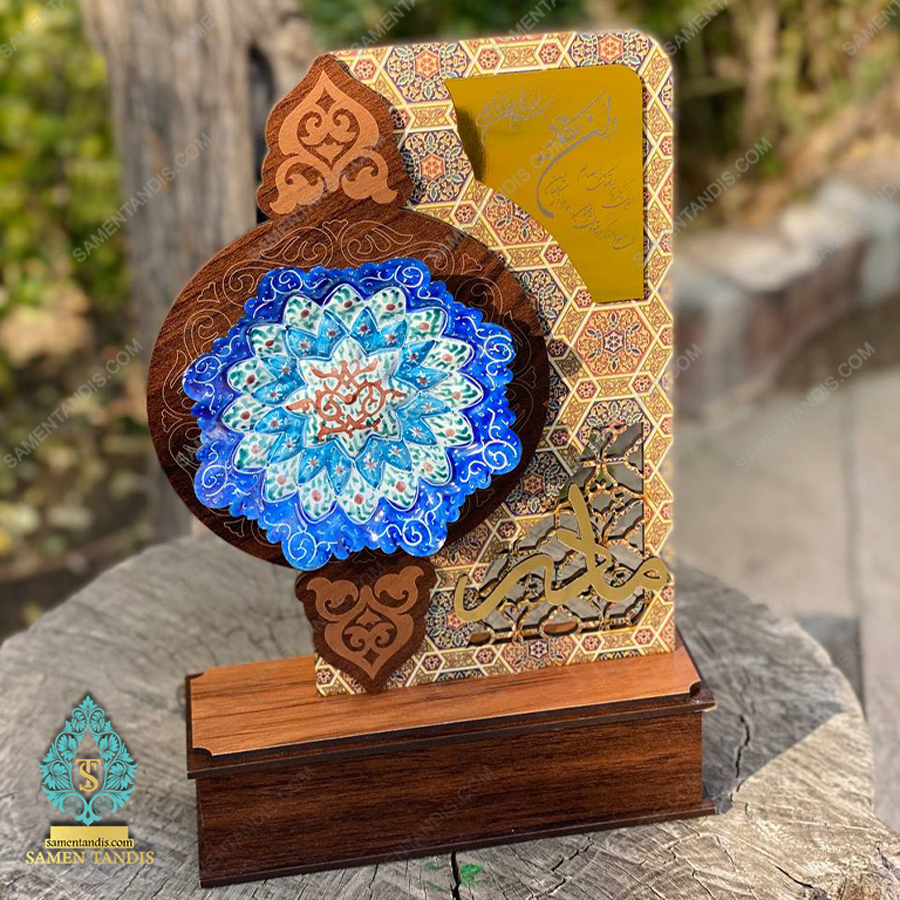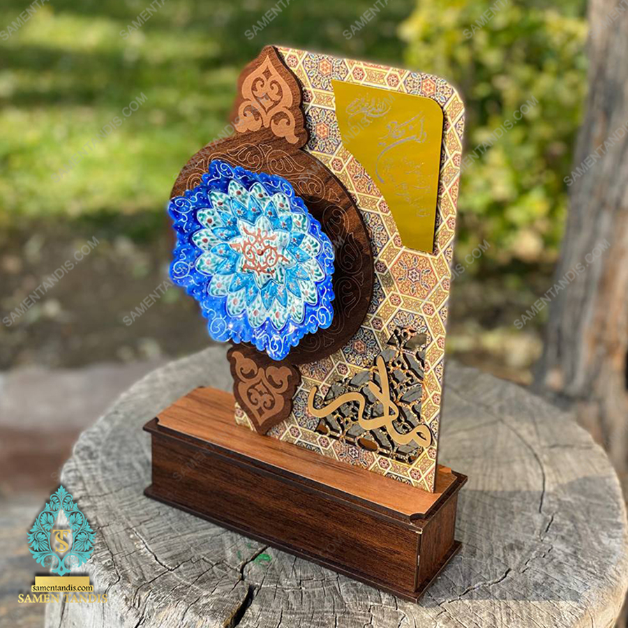 صفحه میناکاری شده با رنگهای لاجوردی و نقوش گل و مرغ، در کنار پایه چوبی و پلاک فلزی “مادر”، جلوهای از عشق، هنر و احترام را به نمایش میگذارد.